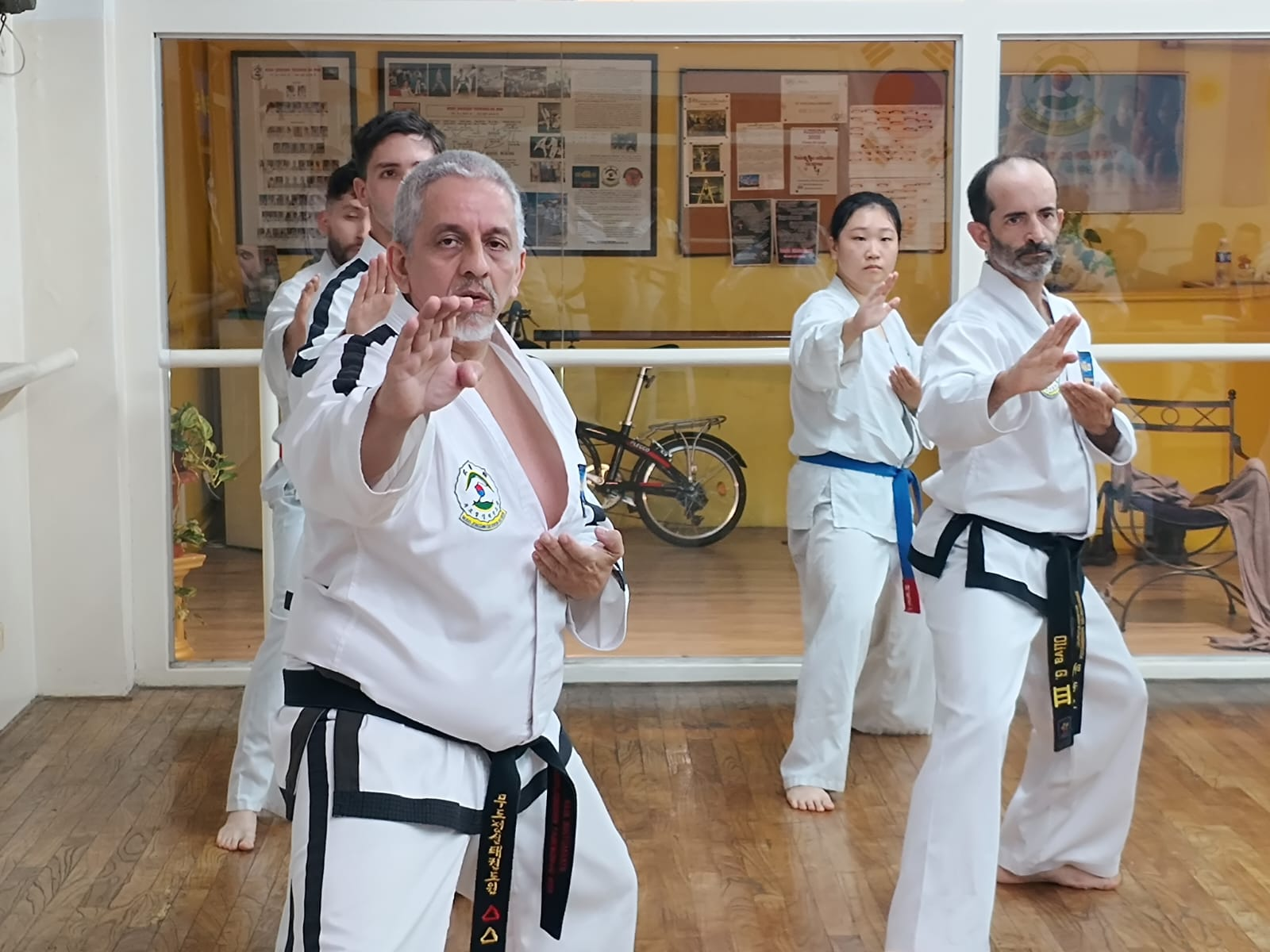 Para eso hemos desarrollado una serie de ejercicios que hacen de puente entre la forma solitaria (Tul y Kibon) y la interacción libre con el oponente: Primero el alumno explora nuestras secuencias de combate a tres pasos (el retroceder acompasando las defensas y distancias con el atacante es un desafío importante), y cuando se siente cómodo con ellos avanza al combate a un paso, que tiene más volumen en cuanto a variedad técnica pero menos utilidad desde lo formativo.